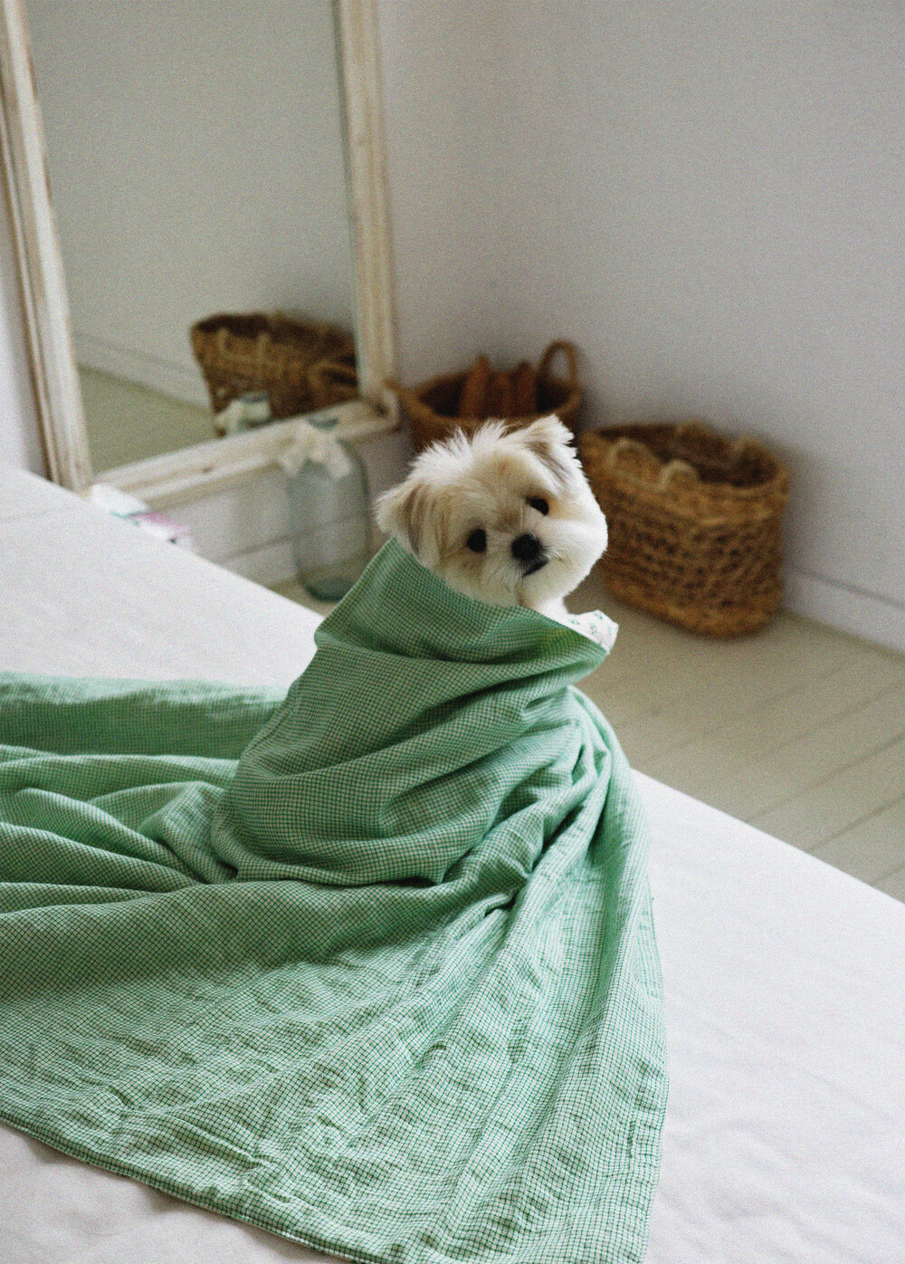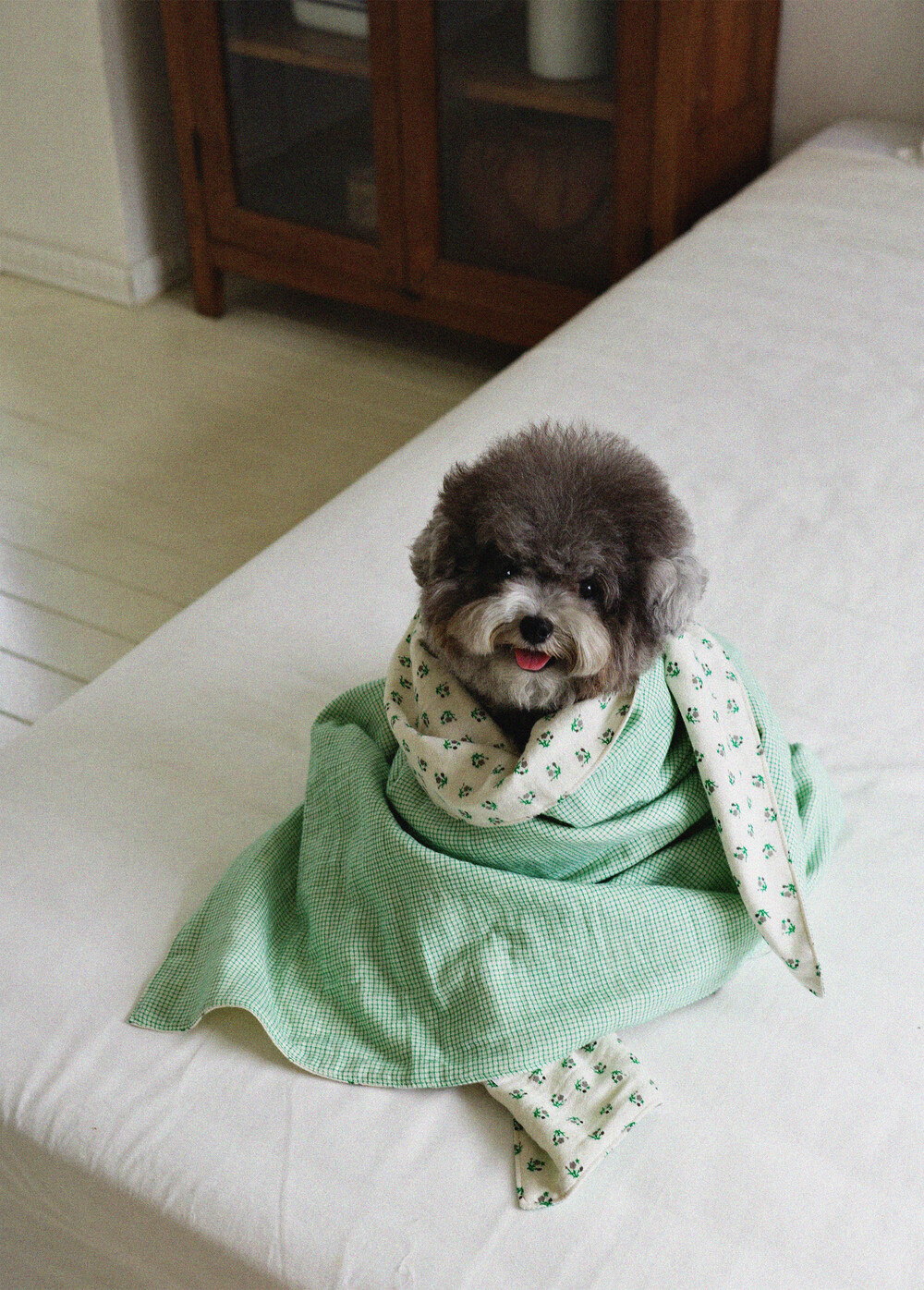 약하게 짜서 평평하고 그늘진 곳에서 자연 건조해 주세요. (비틀어 짜지 마세요)